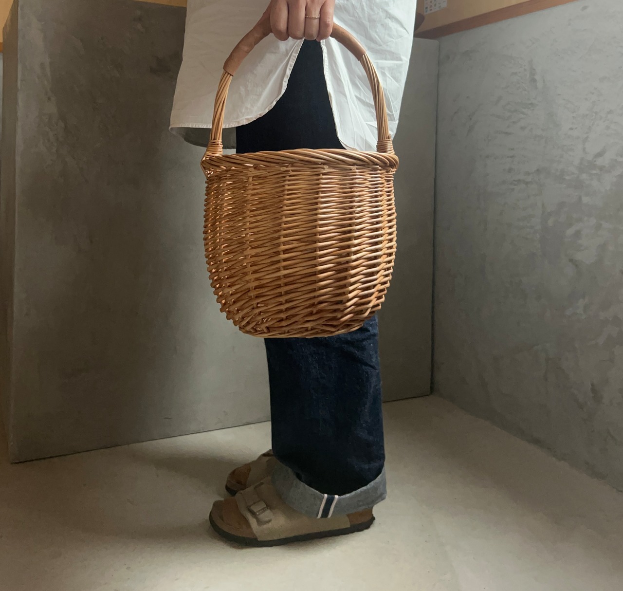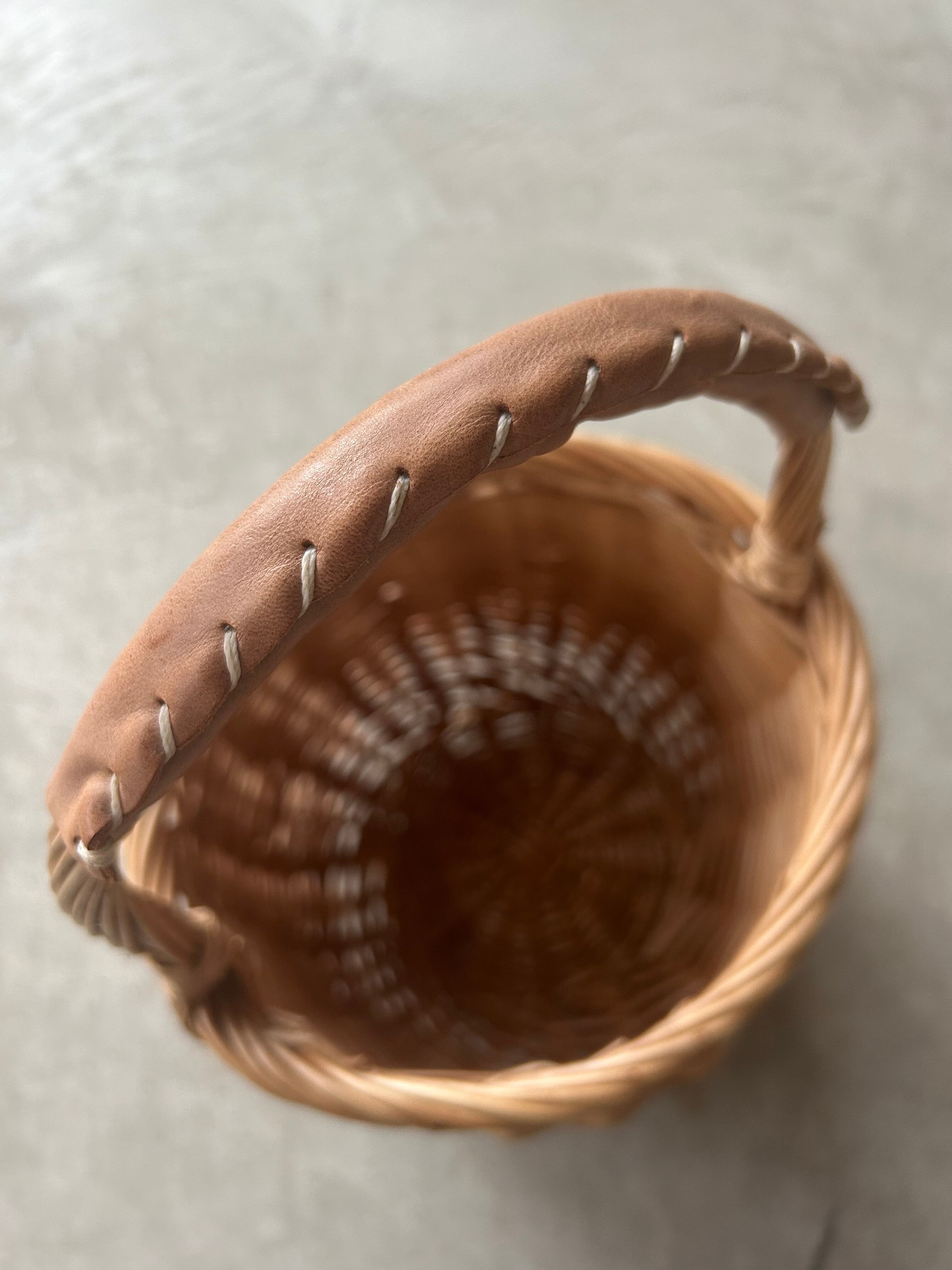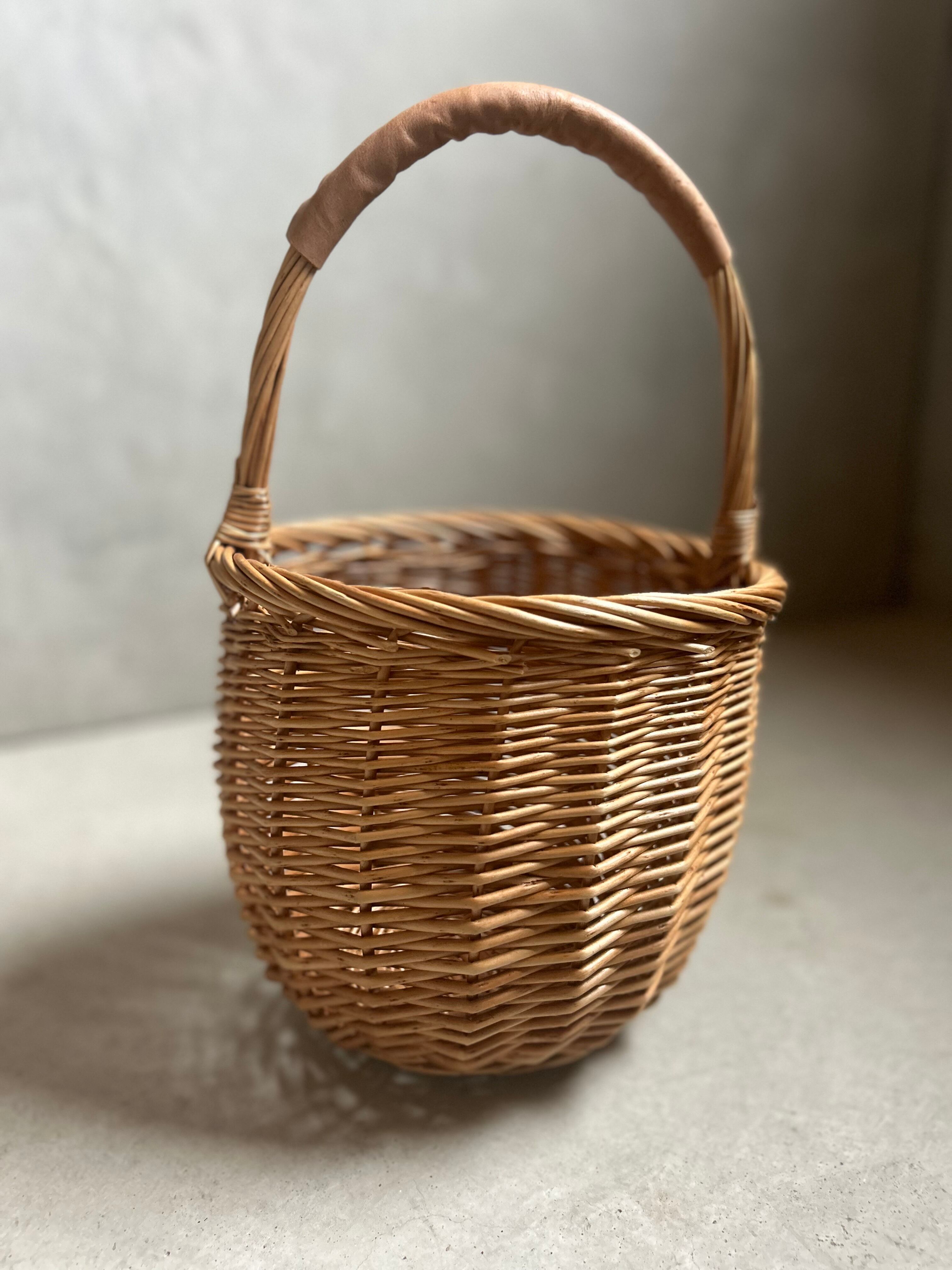 柔らかなベージュの本革持ち手の柳のカゴバスケットです。